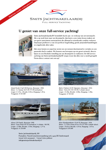 Smits Jachtmakelaardij BV bemiddelt bij de aan- en verkoop van uw motorjacht. Als u op zoek bent naar uw droomjacht, dan kunt u een ruime keuze maken uit een groot assortiment motorjachten die allemaal in uitstekende conditie verkeren. Daarnaast profiteert u van een perfecte begeleiding, goede prijsonderhandelingen en uitgebreide after-sales.