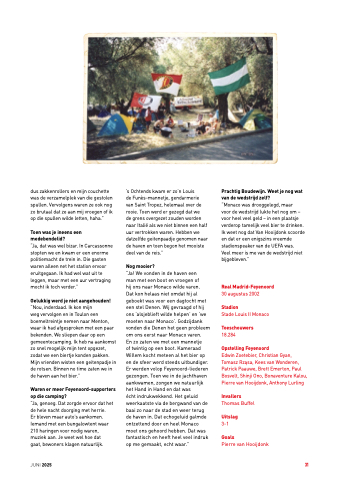 of twintig op een boot. Kameraad Willem kocht meteen al het bier op en de sfeer werd steeds uitbundiger. Er werden volop Feyenoord-liederen gezongen. Toen we in de jachthaven aankwamen, zongen we natuurlijk het Hand in Hand en dat was