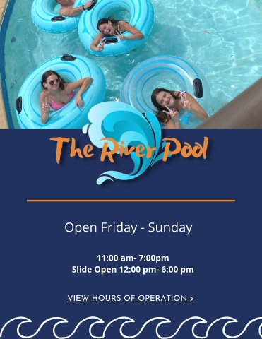 Open Friday - Sunday 11:00 am- 7:00pm Slide Open 12:00 pm- 6:00 pm VIEW HOURS OF OPERATION >