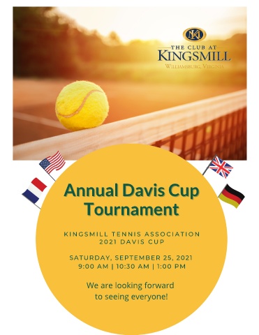 Annual Davis Cup Annual Davis Cup Tournament Tournament K I N G S M I L L T E N N I S A S S O C I A T I O N 2 0 2 1 D A V I S C U P SATURDAY, SEPTEMBER 25, 2021 9:00 AM | 10:30 AM | 1:00 PM We are looking forward to seeing everyone!