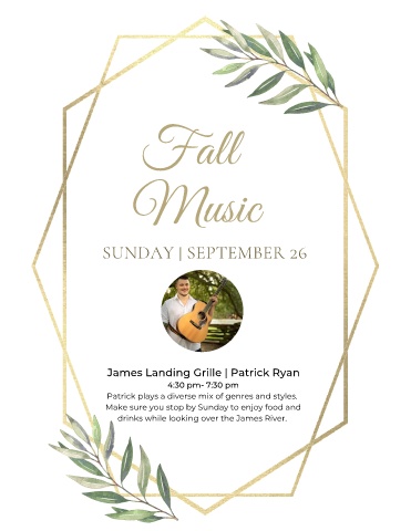Fall Music SUNDAY | SEPTEMBER 26 James Landing Grille | Patrick Ryan 4:30 pm- 7:30 pm Patrick plays a diverse mix of genres and styles. Make sure you stop by Sunday to enjoy food and drinks while looking over the James River.