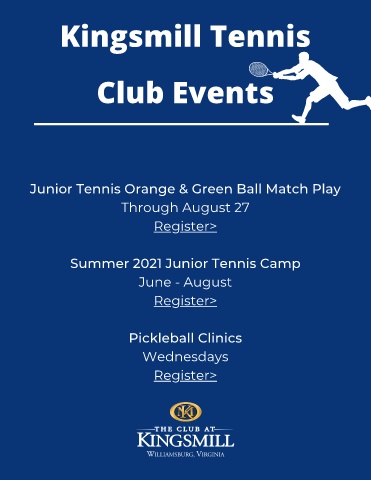 Kingsmill Tennis Club Events Junior Tennis Orange & Green Ball Match Play Through August 27 Register> Summer 2021 Junior Tennis Camp June - August Register> Pickleball Clinics Wednesdays Register>