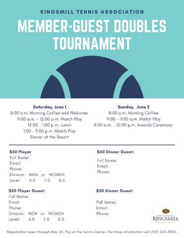 R e g i s t r a t i o n o p e n t h r o u g h M a y 2 5 . P a y a t t h e T e n n i s C e n t e r . F o r m o r e i n f o r m a t i o n c a l l ( 7 5 7 ) 2 5 3 - 3 9 4 5 .