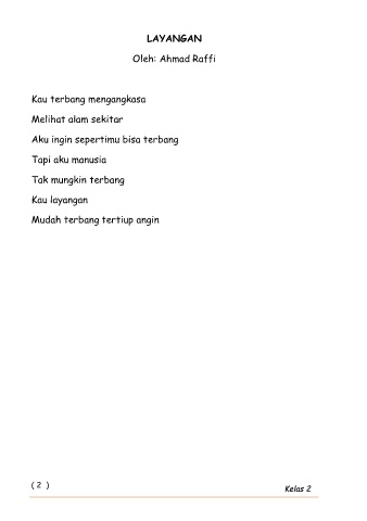 LAYANGAN Oleh: Ahmad Raffi Kau terbang mengangkasa Melihat alam sekitar Aku ingin sepertimu bisa terbang Tapi aku manusia Tak mungkin terbang Kau layangan Mudah terbang tertiup angin ( 2 ) Kelas 2