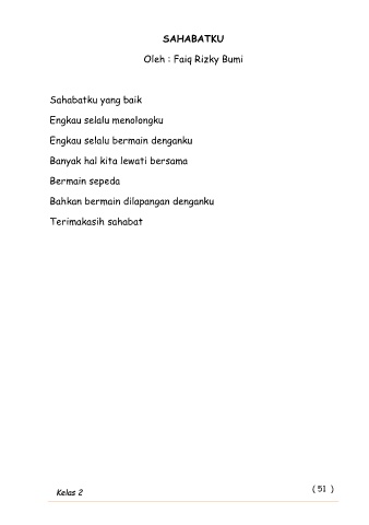 SAHABATKU Oleh : Faiq Rizky Bumi Sahabatku yang baik Engkau selalu menolongku Engkau selalu bermain denganku Banyak hal kita lewati bersama Bermain sepeda Bahkan bermain dilapangan denganku Terimakasih sahabat Kelas 2 ( 51 )