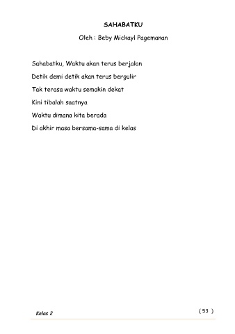 SAHABATKU Oleh : Beby Mickayl Pagemanan Sahabatku, Waktu akan terus berjalan Detik demi detik akan terus bergulir Tak terasa waktu semakin dekat Kini tibalah saatnya Waktu dimana kita berada Di akhir masa bersama-sama di kelas Kelas 2 ( 53 )