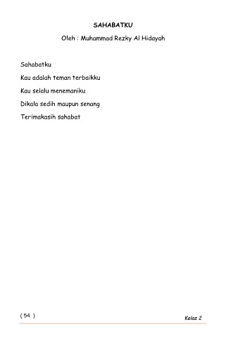 SAHABATKU Oleh : Muhammad Rezky Al Hidayah Sahabatku Kau adalah teman terbaikku Kau selalu menemaniku Dikala sedih maupun senang Terimakasih sahabat ( 54 ) Kelas 2