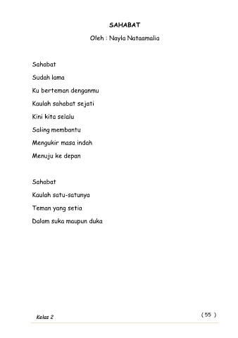 SAHABAT Oleh : Nayla Nataamalia Sahabat Sudah lama Ku berteman denganmu Kaulah sahabat sejati Kini kita selalu Saling membantu Mengukir masa indah Menuju ke depan Sahabat Kaulah satu-satunya Teman yang setia Dalam suka maupun duka Kelas 2 ( 55 )