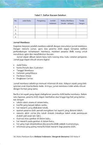 Jurnal membaca sebaiknya memuat informasi di atas. Adapun aspek yang diek-