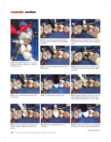 FIG 17: Excess is carefully blown off using oil-free FIG 18: The bond was light-cured for 20sec. FIG 19: Filling the defect with a dual-curing core com-