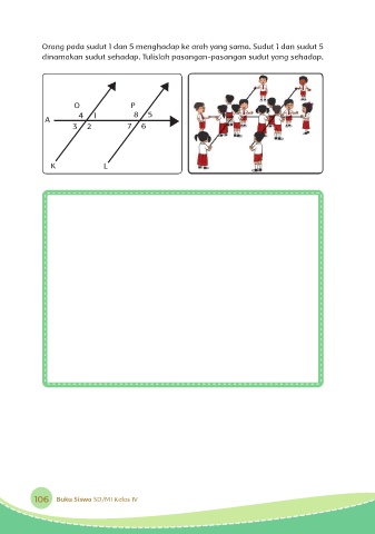 Orang pada sudut 1 dan 5 menghadap ke arah yang sama. Sudut 1 dan sudut 5 dinamakan sudut sehadap. Tulislah pasangan-pasangan sudut yang sehadap. O P 4 1 8 5 A 3 2 7 6 K L 106 Buku Siswa SD/MI Kelas IV