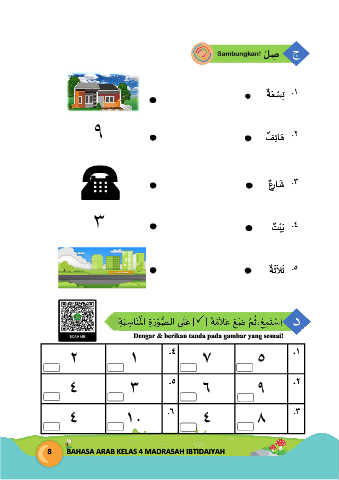 ٌ َ ْ ﺔعﺴ ِ ١ . ﻒتا ٢ . ٌ َ ِ ٌ َ عراش ٣ . ِ ت ب ٤ . ٌ ْ َ ٌ َ َ َ ﺔثﻼث ٥ . Dengar & berikan tanda pada gambar yang sesuai! ٤ . ١ . ٥ . ٢ . ٦ . ٣ . 8 BAHASA ARAB KELAS 4 MADRASAH IBTIDAIYAH