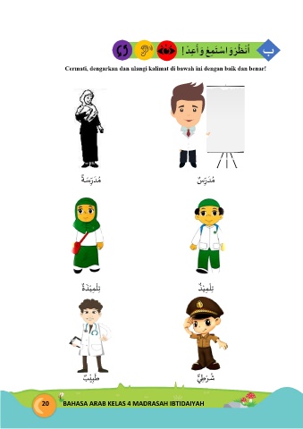 Cermati, dengarkan dan ulangi kalimat di bawah ini dengan baik dan benar! ٌ َ ّ ُ ٌ ّ ُ َ َ ﺔسردم سردم ِ ِ ٌ َ ْ ٌ ْ ْ ْ ةذيملت ذيملت ِ ِ ِ ِ َ ُ ْ ٌ ﱞ ْ ب بﻃ يﻃرش ِ ِ 20 BAHASA ARAB KELAS 4 MADRASAH IBTIDAIYAH