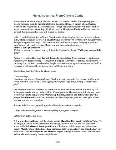 A few years later, Adhiyogi had the chance to visit Manali and her family in Silicon Valley. To his delight, he found a home brimming with energy, purpose, and joy. The two girls were immersed in their classical dance practices, and the home carried a rhythm of balance and beauty. Manali, whose life had once been suspended between uncertainty and hope, had not only recovered — she had completed her Master's degree during her medical leave. Her resilience had transformed adversity into accomplishment.