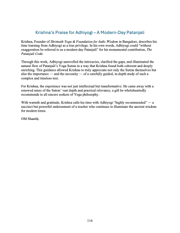 Through this work, Adhiyogi unravelled the intricacies, clarified the gaps, and illuminated the natural flow of Patanjali’s Yoga Sutras in a way that Krishna found both coherent and deeply enriching. This guidance allowed Krishna to truly appreciate not only the Sutras themselves but also the importance — and the necessity — of a carefully guided, in-depth study of such a complex and timeless text.