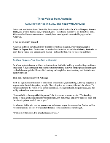 In the vast, sunlit stretches of Australia, three unique individuals—Dr. Clara Morgan, Simona Blake, and a warm-hearted duo, Tara and Alex—each found themselves on distinct life paths. What they had in common was their serendipitous meeting with a remarkable yoga teacher: Adhiyogi.