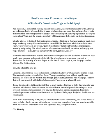 From a one-hour meeting in Mysore, to a transformative week in Germany, to a sacred period of study in Italy—Resl’s journey with Adhiyogi is a shining example of how true learning unfolds when both teacher and student meet with openness, trust, and perseverance.