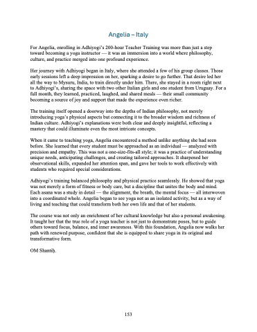 Adhiyogi’s training balanced philosophy and physical practice seamlessly. He showed that yoga was not merely a form of fitness or body care, but a discipline that unites the body and mind. Each asana was a study in detail — the alignment, the breath, the mental focus — all interwoven into a coordinated whole. Angelia began to see yoga not as an isolated activity, but as a way of living and teaching that could transform both her own life and that of her students.