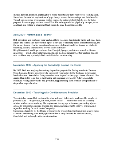 By 2007, Didi was applying her training beyond the yoga studio. During a cruise to Panama, Costa Rica, and Belize, she delivered a successful yoga lecture to the Tuskegee Veterinarian Medical Alumni Association. Many attendees were inspired to join yoga classes afterward. She credited her ability to do this to the training and resources provided by Adhiyogi, and she continued reading the books he had given her, supplementing them with her own purchases to deepen her yoga education.