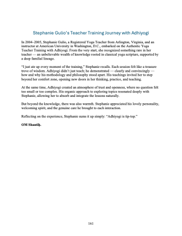 In 2004–2005, Stephanie Gulio, a Registered Yoga Teacher from Arlington, Virginia, and an instructor at American University in Washington, D.C., embarked on the Authentic Yoga Teacher Training with Adhiyogi. From the very start, she recognized something rare in her teacher — an unbelievable wealth of knowledge rooted in classical yoga scripture, supported by a deep familial lineage.