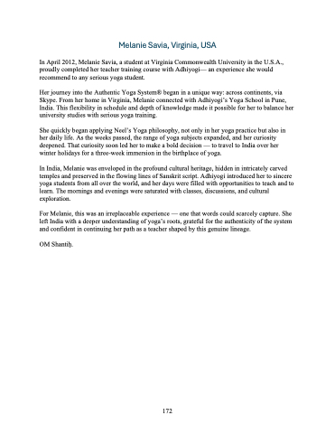In April 2012, Melanie Savia, a student at Virginia Commonwealth University in the U.S.A., proudly completed her teacher training course with Adhiyogi— an experience she would recommend to any serious yoga student.