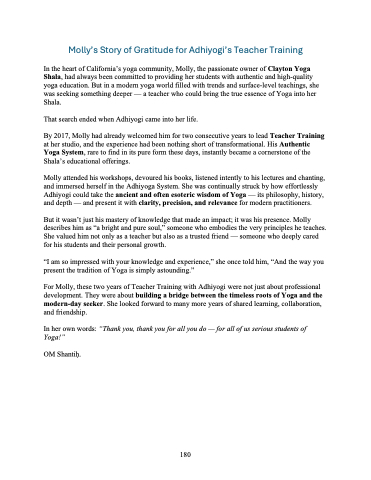 Molly attended his workshops, devoured his books, listened intently to his lectures and chanting, and immersed herself in the Adhiyoga System. She was continually struck by how effortlessly Adhiyogi could take the ancient and often esoteric wisdom of Yoga — its philosophy, history, and depth — and present it with clarity, precision, and relevance for modern practitioners.