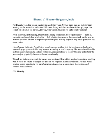 His Adhiyoga Authentic Yoga System book became a guiding text for her, teaching her how to approach yoga systematically, step by step, according to one’s capacity. She appreciated how his method required creativity and self-reflection, urging students to look within and understand the pose not just physically but mentally and emotionally.