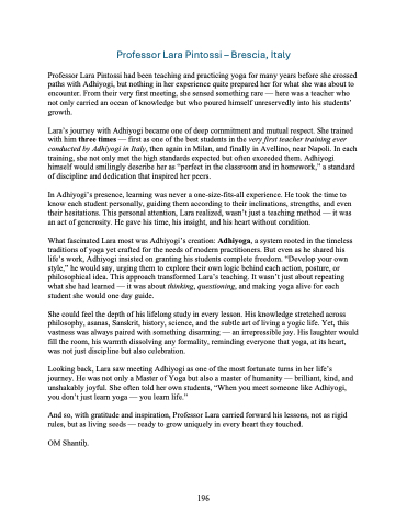 Professor Lara Pintossi had been teaching and practicing yoga for many years before she crossed paths with Adhiyogi, but nothing in her experience quite prepared her for what she was about to encounter. From their very first meeting, she sensed something rare — here was a teacher who not only carried an ocean of knowledge but who poured himself unreservedly into his students’ growth.