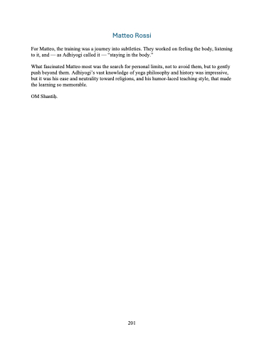 For Matteo, the training was a journey into subtleties. They worked on feeling the body, listening to it, and — as Adhiyogi called it — “staying in the body.”