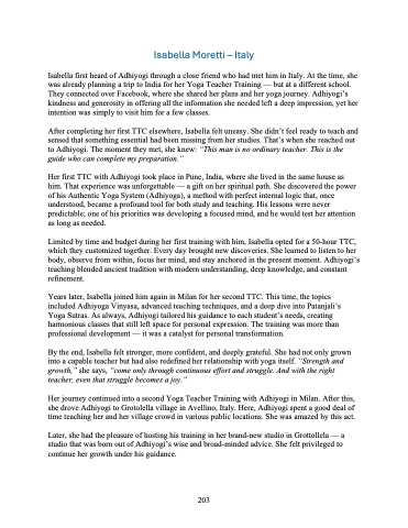 After completing her first TTC elsewhere, Isabella felt uneasy. She didn’t feel ready to teach and sensed that something essential had been missing from her studies. That’s when she reached out to Adhiyogi. The moment they met, she knew: “This man is no ordinary teacher. This is the guide who can complete my preparation.”