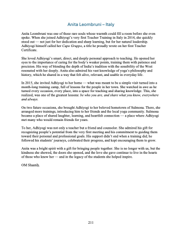 Anita Leombruni was one of those rare souls whose warmth could fill a room before she even spoke. When she joined Adhiyogi’s very first Teacher Training in Italy in 2014, she quickly stood out — not just for her dedication and sharp learning, but for her natural leadership. Adhiyogi himself called her Capo Gruppo, a title he proudly wrote on her first Teacher Certificate.