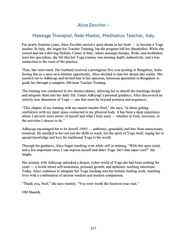 Her journey with Adhiyogi unlocked a deeper, richer world of Yoga she had been seeking for years — a world where self-awareness, personal growth, and authentic teaching intertwine. Today, Alice continues to integrate her Yoga teaching into her holistic healing work, touching lives with a combination of ancient wisdom and modern compassion.