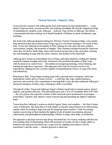 Teresa describes Adhiyogi’s system as entirely logical, linear, and complete — the fruit of many years of dedication. She notes that it is both simple in structure and profound in its effectiveness, equally suited for leading a yoga class and for preparing future teachers. Under his training, teachers can develop in their students the highest levels of mental concentration, physical achievement, and philosophical understanding, whether in asana, sutra study, or meditation.