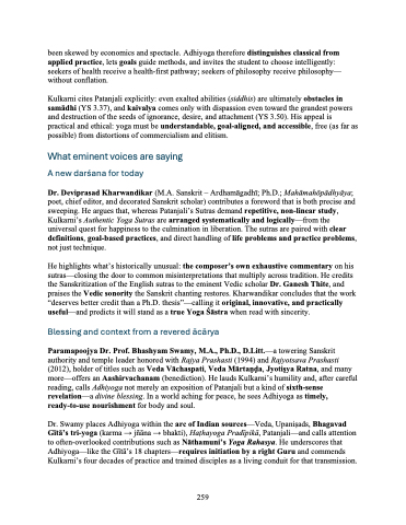 Paramapoojya Dr. Prof. Bhashyam Swamy, M.A., Ph.D., D.Litt.—a towering Sanskrit authority and temple leader honored with Rajya Prashasti (1994) and Rajyotsava Prashasti (2012), holder of titles such as Veda Vāchaspati, Veda Mārtaṇḍa, Jyotiṣya Ratna, and many more—offers an Aashirvachanam (benediction). He lauds Kulkarni’s humility and, after careful reading, calls Adhiyoga not merely an exposition of Patanjali but a kind of sixth-sense revelation—a divine blessing. In a world aching for peace, he sees Adhiyoga as timely, ready-to-use nourishment for body and soul.