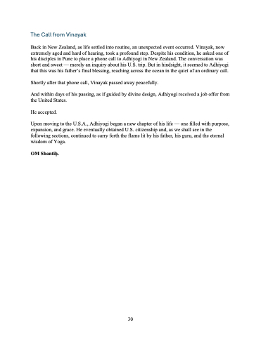 Back in New Zealand, as life settled into routine, an unexpected event occurred. Vinayak, now extremely aged and hard of hearing, took a profound step. Despite his condition, he asked one of his disciples in Pune to place a phone call to Adhiyogi in New Zealand. The conversation was short and sweet — merely an inquiry about his U.S. trip. But in hindsight, it seemed to Adhiyogi that this was his father’s final blessing, reaching across the ocean in the quiet of an ordinary call.