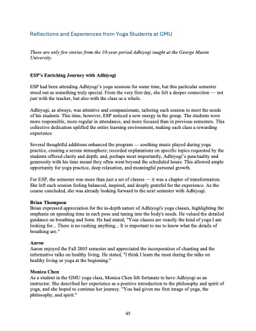 As a student in the GMU yoga class, Monica Chen felt fortunate to have Adhiyogi as an instructor. She described her experience as a positive introduction to the philosophy and spirit of yoga, and she hoped to continue her journey. "You had given me first image of yoga, the philosophy, and spirit."