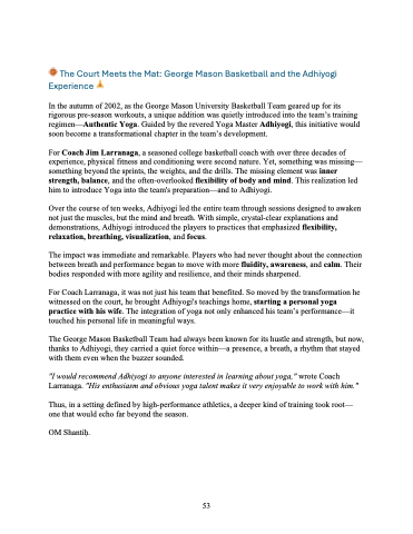 In the autumn of 2002, as the George Mason University Basketball Team geared up for its rigorous pre-season workouts, a unique addition was quietly introduced into the teamâs training regimenâAuthentic Yoga. Guided by the revered Yoga Master Adhiyogi, this initiative would soon become a transformational chapter in the teamâs development.