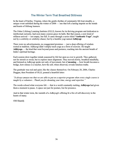 The Osher Lifelong Learning Institute (OLLI), known for its thriving program and dedication to intellectual curiosity, had seen many courses grace its halls. But that season, a new kind of stillness arrived — not empty, but full. It came through a series titled “Authentic Yoga”, taught not by a celebrity or celebrity-chaser, but by a humble yogi named Adhiyogi.
