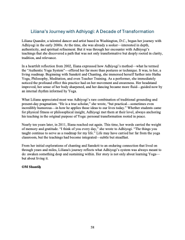 Liliana Quander, a talented dancer and artist based in Washington, D.C., began her journey with Adhiyogi in the early 2000s. At the time, she was already a seeker—interested in depth, authenticity, and spiritual refinement. But it was through her encounter with Adhiyogi’s teachings that she discovered a path that was not only transformative but deeply rooted in clarity, tradition, and relevance.
