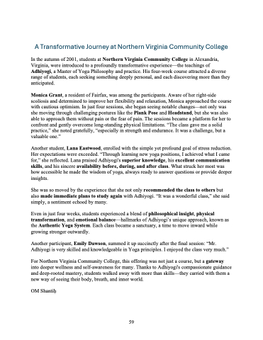 In the autumn of 2001, students at Northern Virginia Community College in Alexandria, Virginia, were introduced to a profoundly transformative experience—the teachings of Adhiyogi, a Master of Yoga Philosophy and practice. His four-week course attracted a diverse range of students, each seeking something deeply personal, and each discovering more than they anticipated.