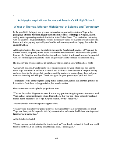 In the year 2001, Adhiyogi was given an extraordinary opportunity—to teach Yoga at the prestigious Thomas Jefferson High School of Science and Technology in Virginia, known widely as the top-ranking academic institution in the United States. This institution, brimming with the country’s brightest students, became the unlikely venue for a gentle revolution in body, breath, and mind, quietly sparked by the humble and voluntary service of a yogi devoted to the ancient tradition.