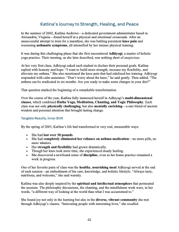 At her very first class, Adhiyogi asked each student to declare their personal goals. Katlina replied with honesty and hope: “I want to build more strength, increase my flexibility, and alleviate my asthma.” She also mentioned the knee pain that had sidelined her training. Adhiyogi responded with calm assurance. “Don’t worry about the knee,” he said gently. Then added, “The asthma can be eradicated in six months. Are you ready to make some changes in your diet?”