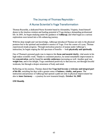 Reflecting on his journey, Thomas shared that Yoga had become a welcome and integral part of his life, enriching his days with a greater sense of balance, vitality, and peace. The instruction and presence of Adhiyogi had opened a path not only to physical improvement but also to inner harmony — a journey he now treasured deeply. October 16, 2002