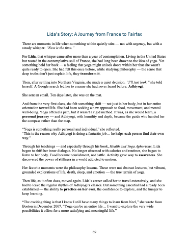 Through his teachings — and especially through his book, Health and Yoga Aphorisms, Lida began to shift her inner dialogue. No longer obsessed with calories and routines, she began to listen to her body. Food became nourishment, not battle. Activity gave way to awareness. She discovered the power of stillness in a world addicted to motion.