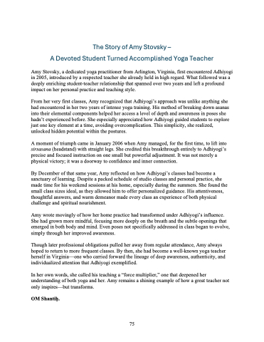 Though later professional obligations pulled her away from regular attendance, Amy always hoped to return to more frequent classes. By then, she had become a well-known yoga teacher herself in Virginia—one who carried forward the lineage of deep awareness, authenticity, and individualized attention that Adhiyogi exemplified.
