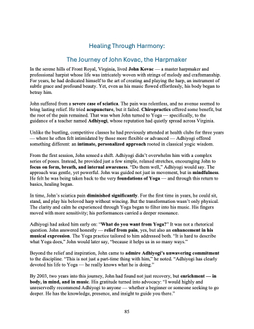 In time, John’s sciatica pain diminished significantly. For the first time in years, he could sit, stand, and play his beloved harp without wincing. But the transformation wasn’t only physical. The clarity and calm he experienced through Yoga began to filter into his music. His fingers moved with more sensitivity; his performances carried a deeper resonance.