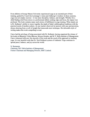 I have had the privilege of being associated with Dr. Kulkarni, having organized the release of his books at Bharatiya Vidya Bhavan, Mysore Kendra, and M. P. Birla Institute of Management. I have witnessed with awe, the sincerity of his work and the reach of his approach to teaching yoga. It is my heartfelt wish that Dr. Neel Kulkarni system of Authentic Yoga continues to spread peace, balance, and joy across the world.