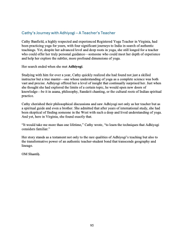 “It would take me more than one lifetime,” Cathy wrote, “to learn the techniques that Adhiyogi considers familiar.”