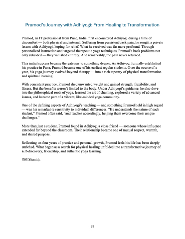 One of the defining aspects of Adhiyogi’s teaching — and something Pramod held in high regard — was his remarkable sensitivity to individual differences. “He understands the nature of each student,” Pramod often said, “and teaches accordingly, helping them overcome their unique challenges.”