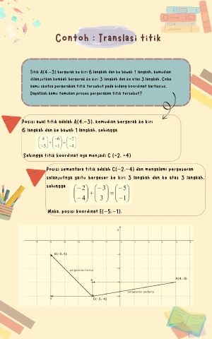 Titik A(4,–3) bergerak ke kiri 6 langkah dan ke bawah 1 langkah, kemudian
